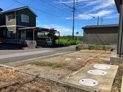 南面道路に駐車スペースと間口も広く陽当り良好です。駐車スペースも並列4台可能。